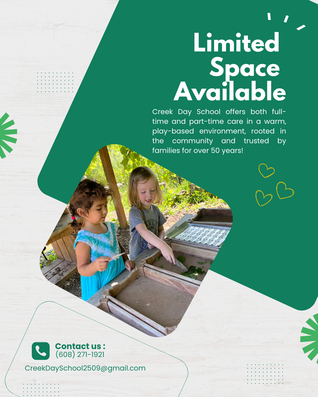 Creek Day School is a childcare center offering full and part-time care to meet the diverse needs of families. Creek serves children ages two to five years, year-round.